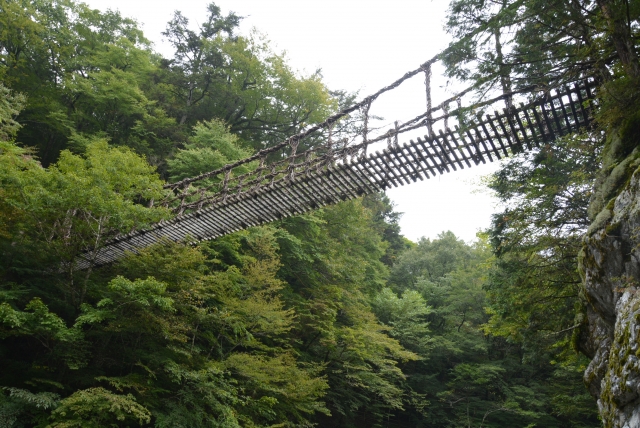◆ 国指定重要有形民俗文化財 ◆平家一族の哀話を秘める、秘境“祖谷”にあるかずら橋。シラクチカズラ(重さ約6トン)で作られたもので、長さ45m・幅2m・水面上14m。 昔は深山渓谷地帯の唯一の交通施設であった。3年毎に架替えが行われる。急峻...